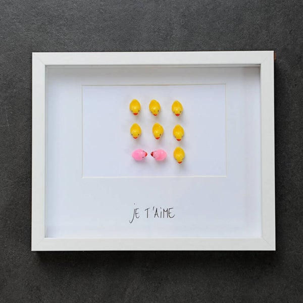 Strakke witte kader met de quote 'Je 't aime'. De eendjes geven een grappige en leuke toets aan het geheel.