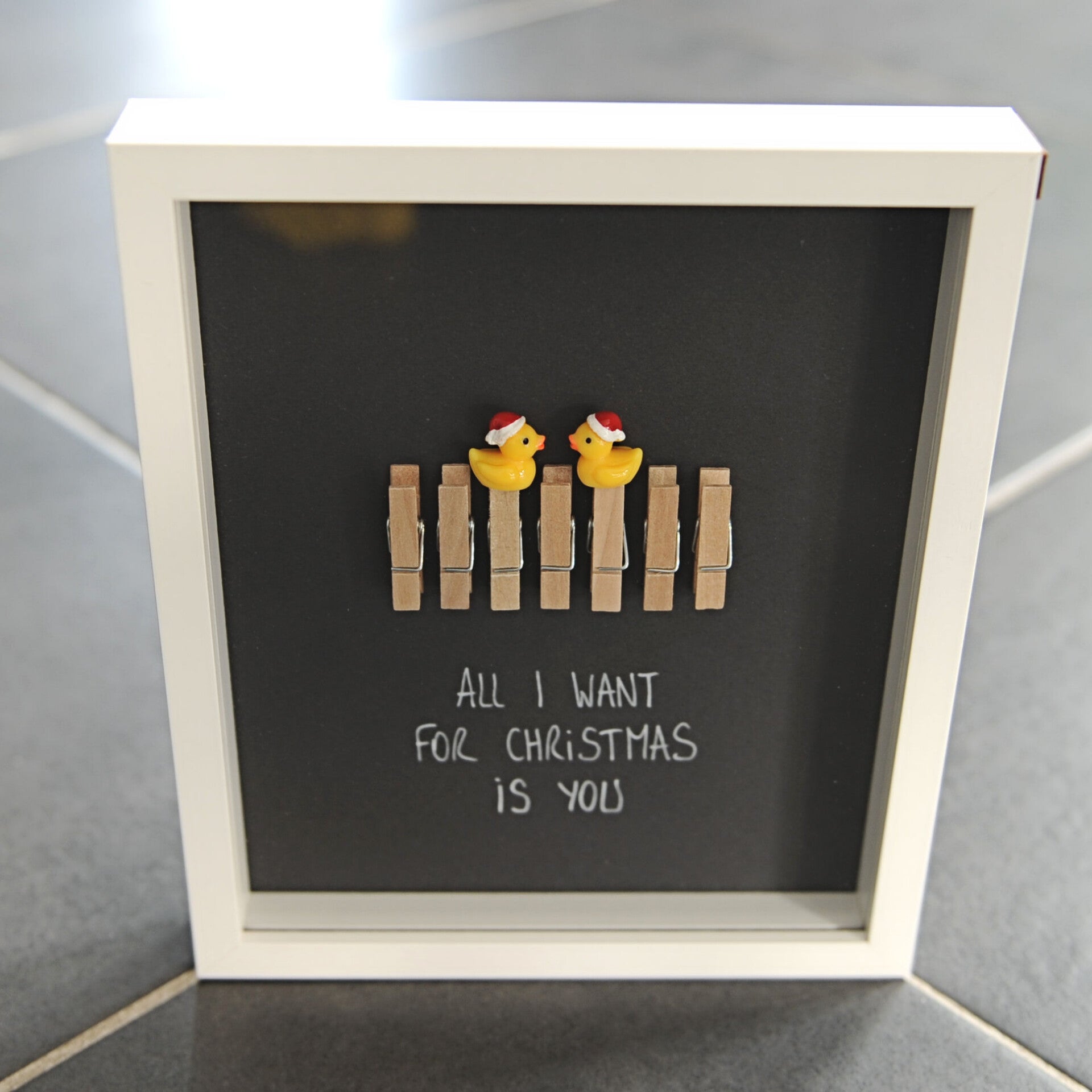 Strakke witte kader met de quote 'All I want for Christmas is you'. De eendjes geven een grappige en leuke toets aan het geheel.